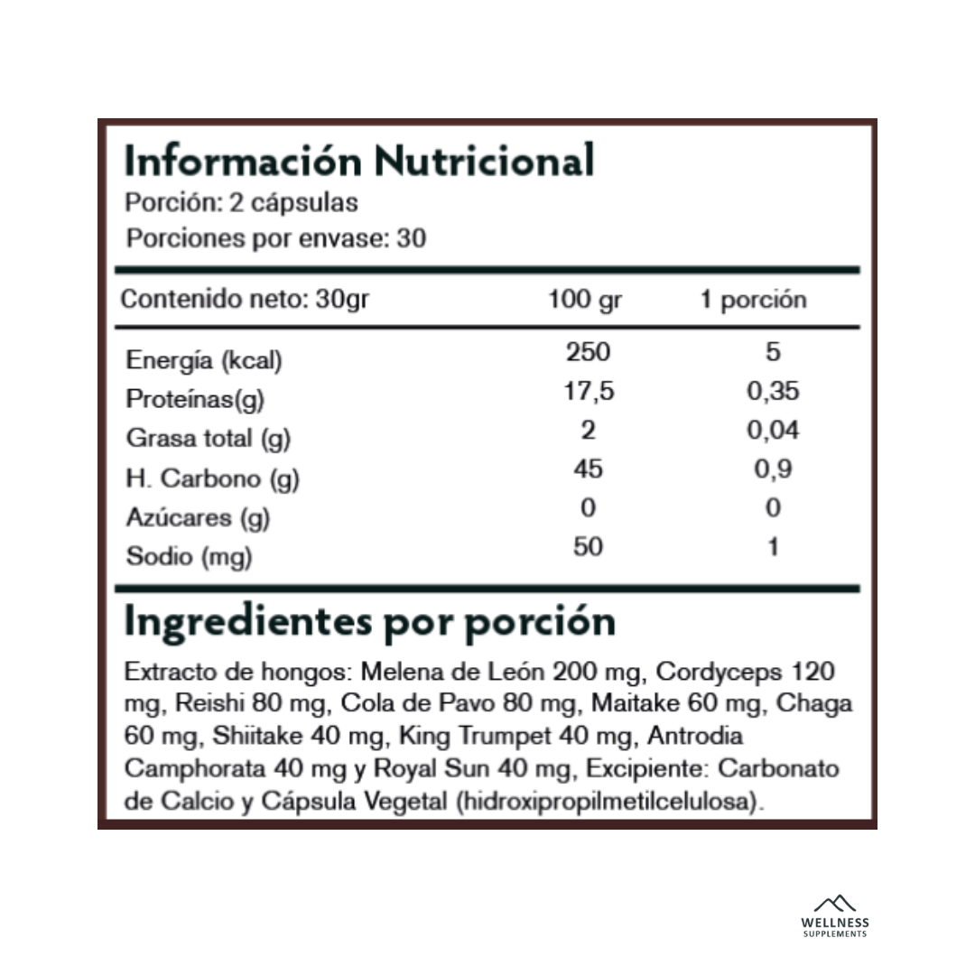 Cada dosis diaria (2 cápsulas) incluye extractos estandarizados de 10 hongos funcionales.