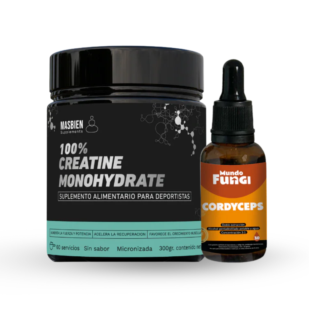 El Pack Deportivo Masbien combina Creatina Monohidratada y Cordyceps en gotas, dos de los suplementos más estudiados para mejorar el rendimiento físico, aumentar la energía celular y acelerar la recuperación muscular. Un aliado natural y potente para llevar tus entrenamientos al siguiente nivel.
