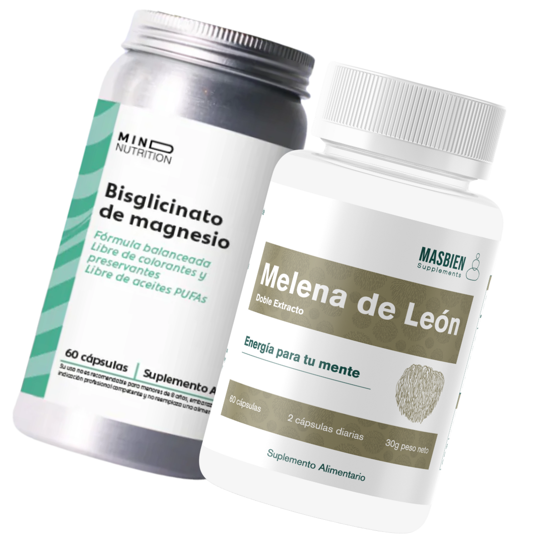 El Pack Enfoque Total Masbien une el poder de la Melena de León, hongo neuroactivo que estimula la memoria y la regeneración neuronal, con el Bisglicinato de Magnesio, mineral clave para calmar el sistema nervioso y mejorar la claridad mental. Una combinación perfecta para lograr foco real sin estrés.