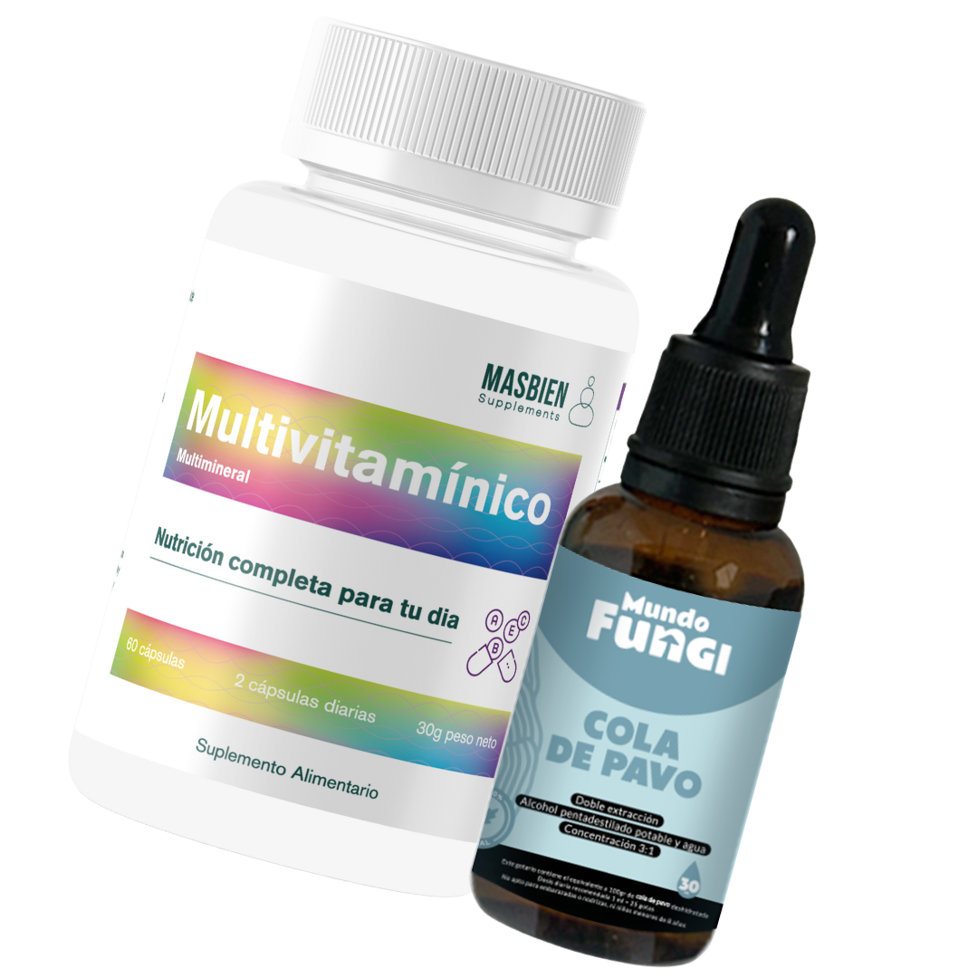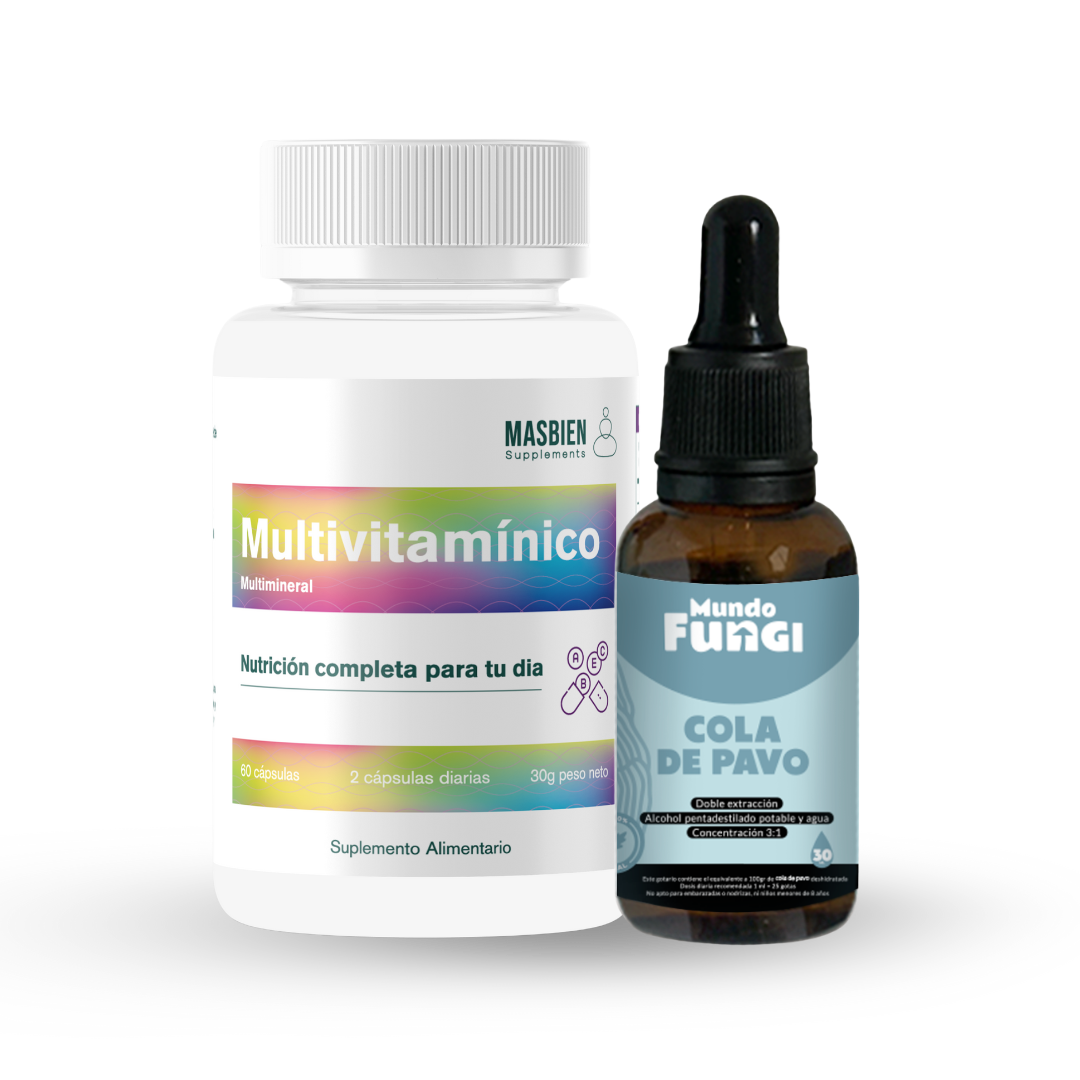 El Pack Escudo Natural Masbien combina un Multivitamínico muy completo para tu bienestar general y Cola de Pavo en gotas, dos aliados esenciales para reforzar tu sistema inmune, cuidar tu vitalidad y protegerte frente a periodos de mayor exigencia.